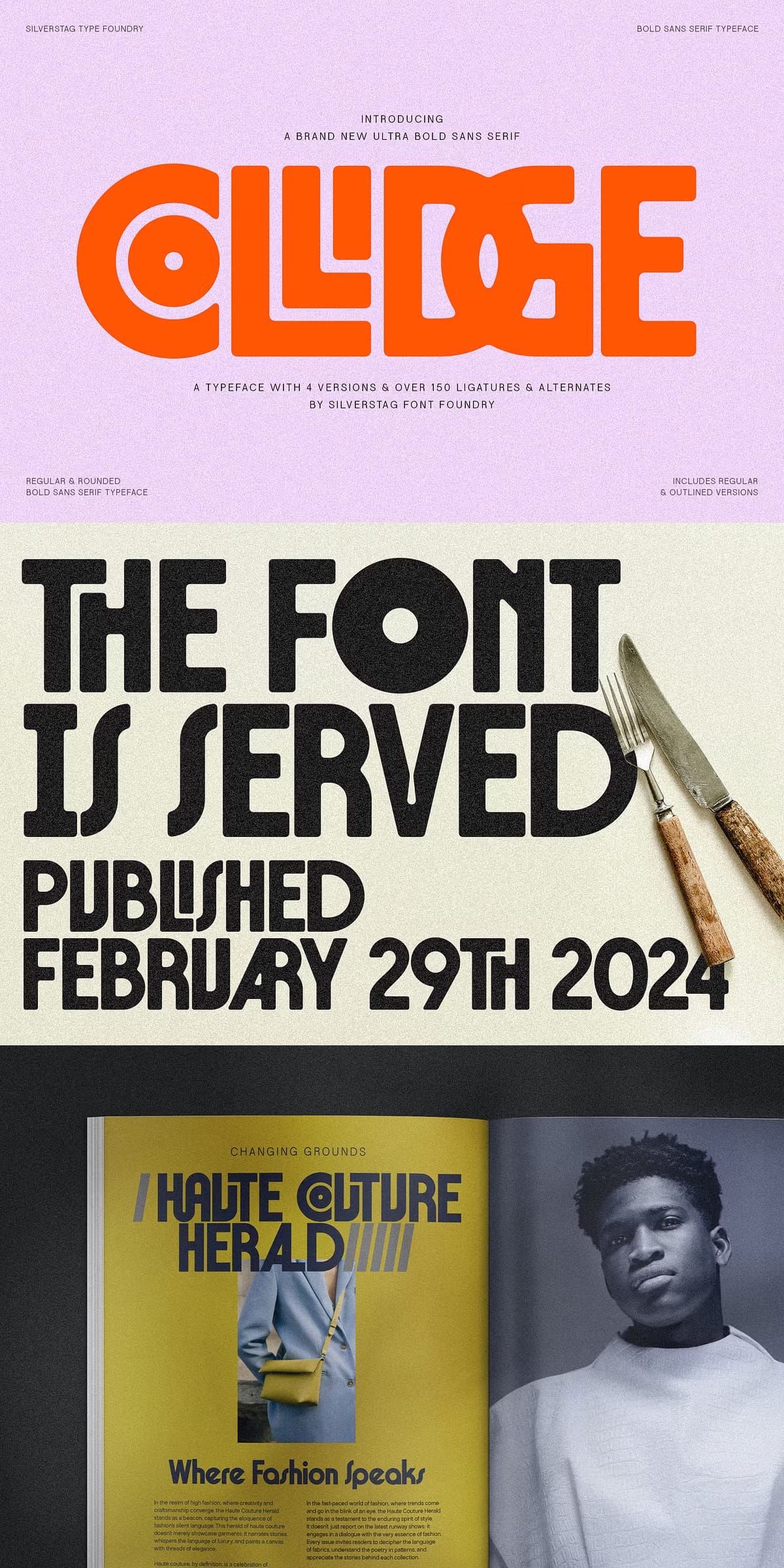 - Branding: Create a memorable brand identity with Collidge. Its bold presence makes it ideal for logos and marketing materials.