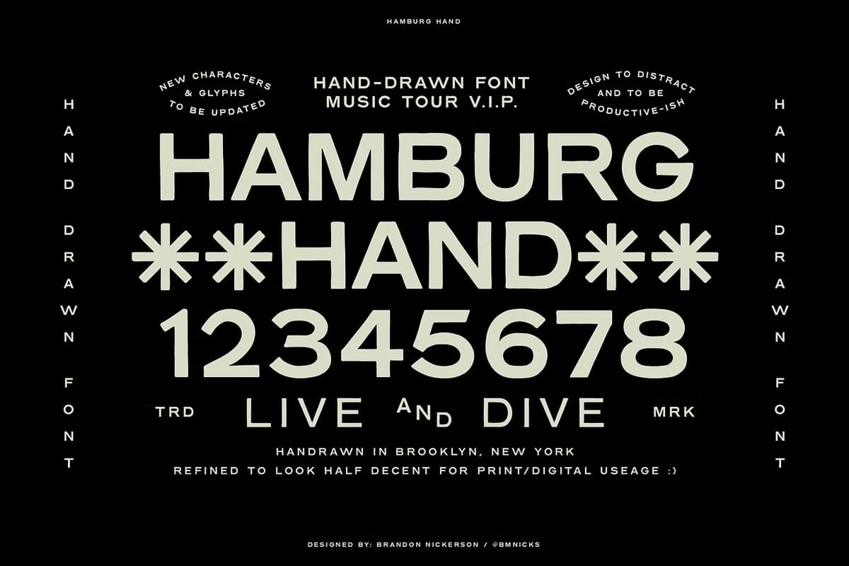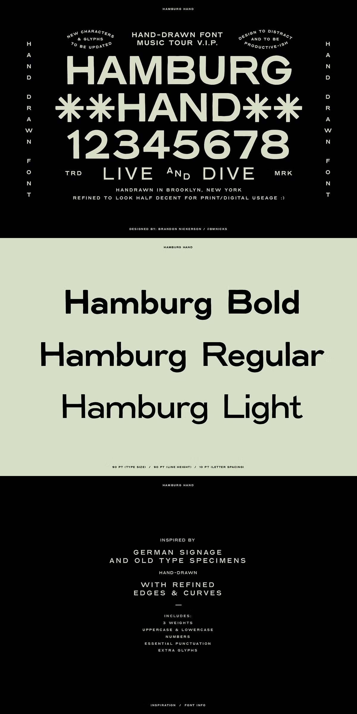 Unleash your creativity with Hamburg Hand, an exceptional hand-drawn font that draws inspiration from the rich history of German signage and various vintage type specimens. This font captures the essence of traditional craftsmanship while offering modern versatility for today’s design needs.