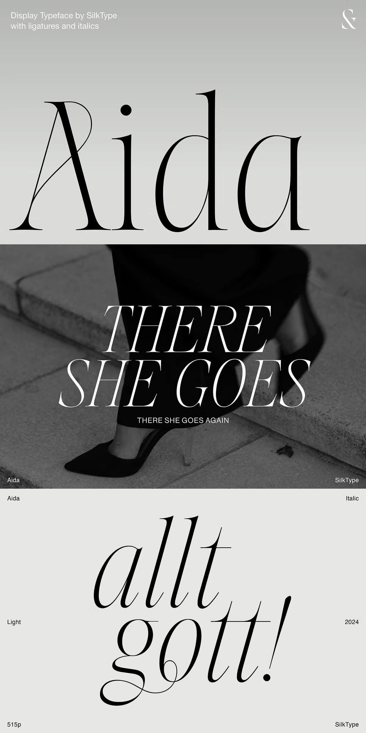 Aida is more than just a typeface; it’s an artistic tool designed to elevate your creative vision. Its high contrast elements command attention without overwhelming the viewer. This balance makes it especially suitable for projects where elegance meets impact — from fashion editorials to premium product branding.